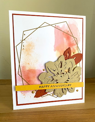 An Anniversary card today using the Pink Fresh Studio Washi tape. This comes on a roll and it's about 5 1/2" high, so much wider than usual washi tape. There are different colour tone frames on the roll, so I teamed some gold pearl cardstock with it and some dark reds. It's another card using the Sizzix Floral Layers die, this time though, all the layers have been cut in the same cardstock. I finished it off with thin strip sentiment and added some Nuvo drops to embellish.