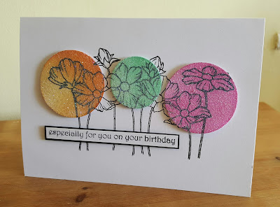 I recently made two cards using the Woodware Cosmos flower stamp. I will post the other card next time but todays one uses an old technique I haven't don't for a while so thought it was time I did it again. Its a twist on the spotlight technique, I stamped the whole image with Black Archival ink directly onto my card base. I then stamped it again on some spare cardstock. I used some circle punches but you could use circle dies and punched out 3 circles containing different parts of the stamp. I used some Tim Holtz Distress inks to blend different colours over each of the circles. I used Picked Raspberry, Cracked Pistachio and Spiced Marmalade. I then covered each one with Versamark ink and sprinkled with Creative Expressions Sticky embossing powder. Different company's call it different names basically its a clear embossing powder which stays sticky once heated. I then covered it with Glamour Dust glitter, any clear transparent glitter would do....the finer the better. I like to give it another quick blast with the heat gun to make sure the glitter has adhered to the embossing powder. Its not showing up so good it photo but it is really twinkly. I then added some foam pads behind each circle and matched it up perfectly with the main image on my bard base. I finished off with the sentiment from the set just stamped and matted onto some Black cardstock.