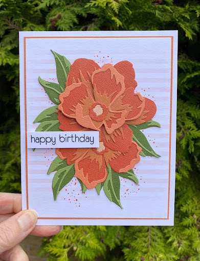 Happy Sunday, I hope you are enjoying the bank holiday weekend. Not sure what's happening with the weather as its blimin freezing, looking forward to the hot weather returning next month. Today's card uses quite autumnal colours, although it wasn't planned as I made it weeks ago. I dug out some different tones of orange and green card and made the flower up using the Peony die. The background is a Altenew stencil and I found a splatter stamp in my stash to make the dots. Finished off with a sentiment and some more orange card as a mat on the back.